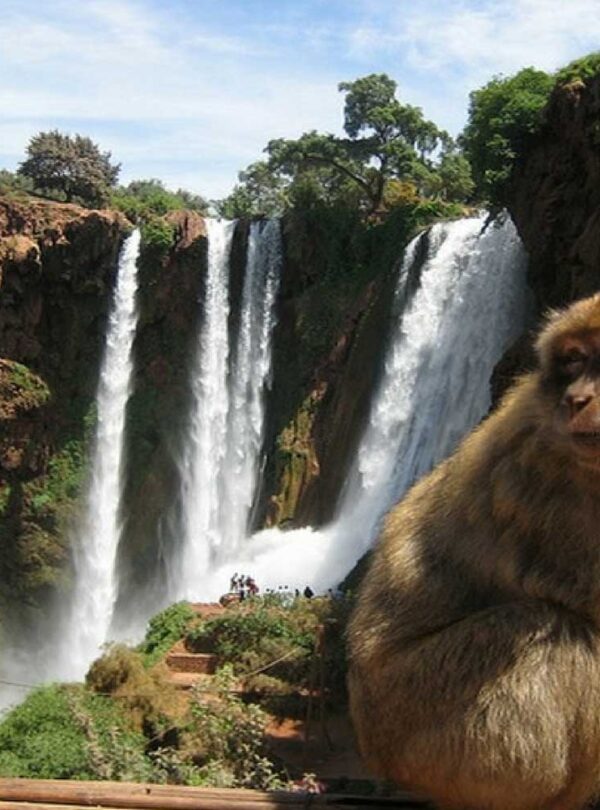 At the top of the waterfall, a stone’s throw from the impressive chasm, there are a dozen old small grain mills, still in operation thanks to the water from the torrent. At dusk, you can see entire families of monkeys messing around in the carob trees, these large trees with tasty fruits that they love. A hundred Barbary macaques, with beige fur and eyes ringed with a black line, have in fact taken up residence in the caves in the cliffs.